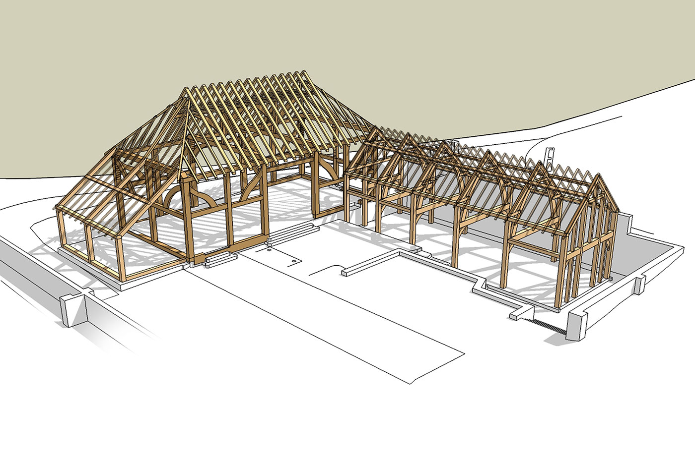 Green Oak framed extension and restoration to an existing, circa 15th century barn. Initially our involvement and appointment, RIBA Stage A-D to evolve the scheme design with the client to obtain planning approval. The scheme developed to the preparation of more detailed proposals, RIBA Stage E-F, along with specialist to prepare full working drawings and schedules to discharge planning conditions on the existing structure.