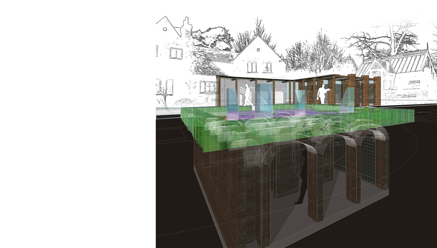 Extension to an existing Grade 2 listed house. Works comprising a 450 sq ft below ground wine cellar and linking pergola structure.