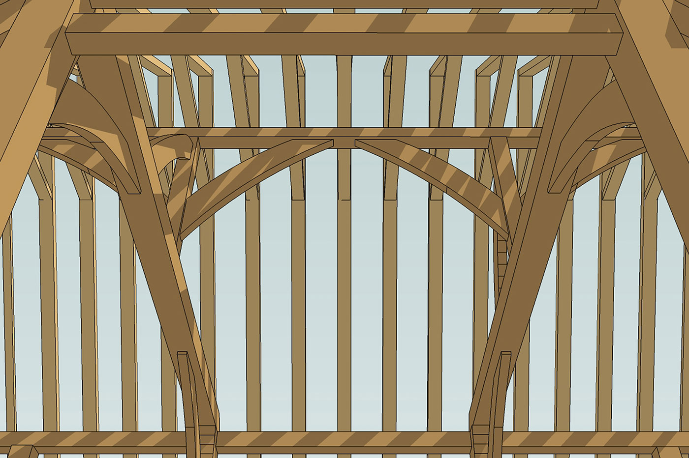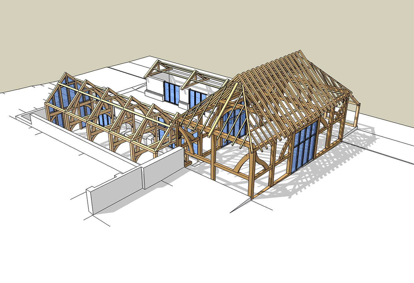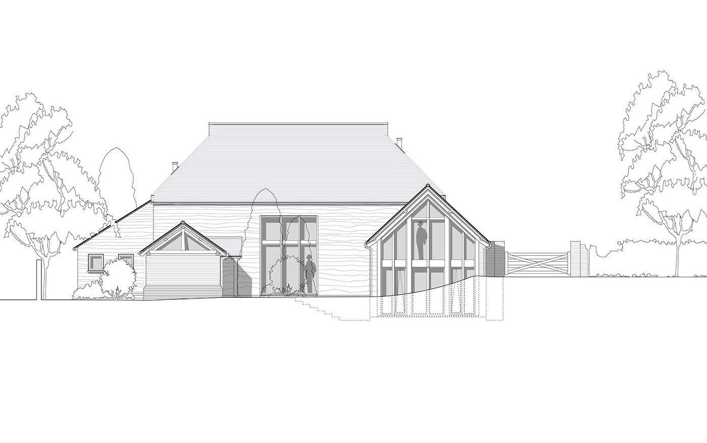 Green Oak framed extension and restoration to an existing, circa 15th century barn. Initially our involvement and appointment, RIBA Stage A-D to evolve the scheme design with the client to obtain planning approval. The scheme developed to the preparation of more detailed proposals, RIBA Stage E-F, along with specialist to prepare full working drawings and schedules to discharge planning conditions on the existing structure.